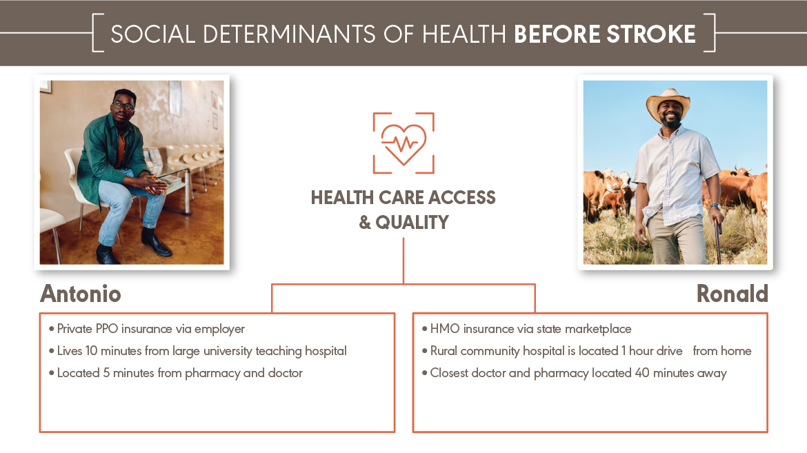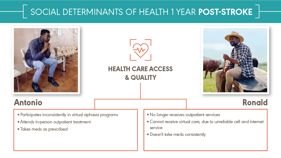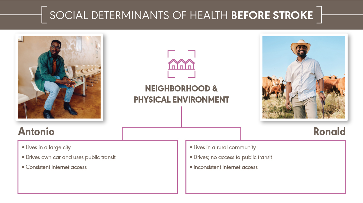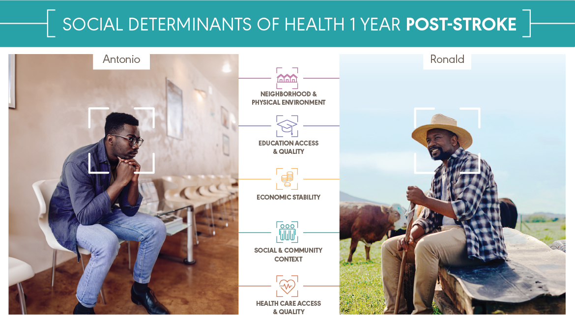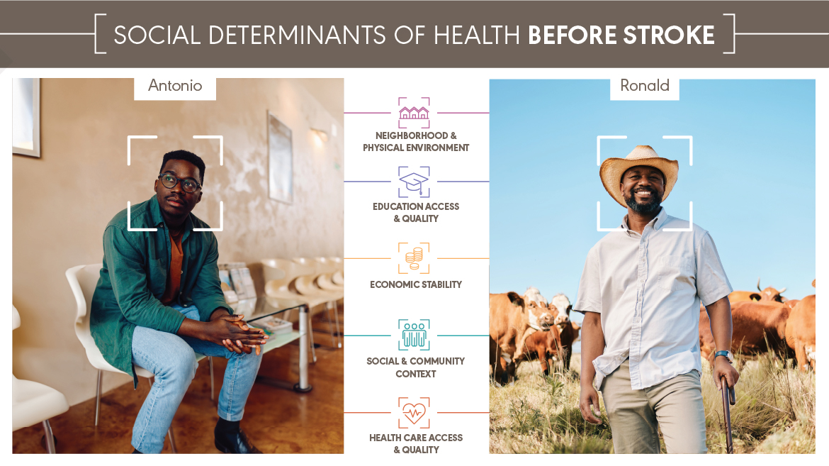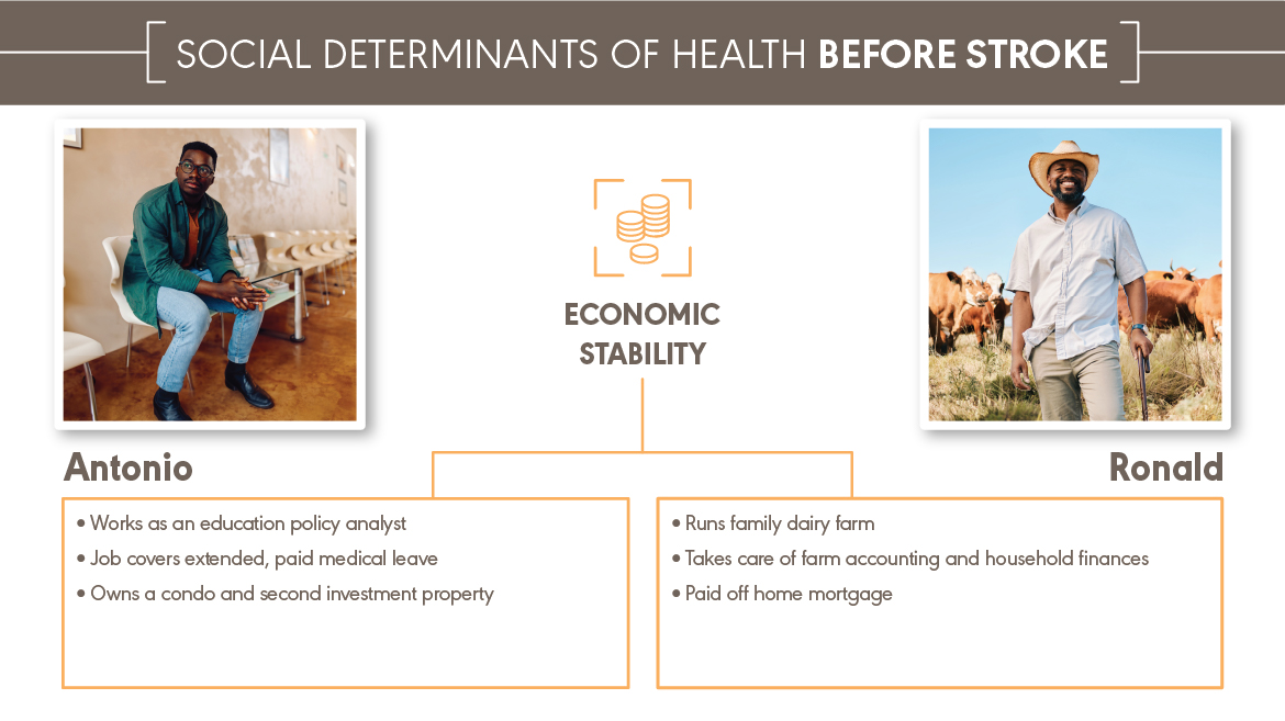 Antonio and Ronald both experienced a major health event—a stroke. They received the same medical diagnosis. They have different social determinants of health (SDOH). Antonio and Ronald are fictional characters, but they represent the many people with the same diagnosis and different SDOH that audiologists and speech-language pathologists work with every day. You can explore how a stroke affects Antonio and Ronald’s SDOH below and download the content at the bottom of the page.
