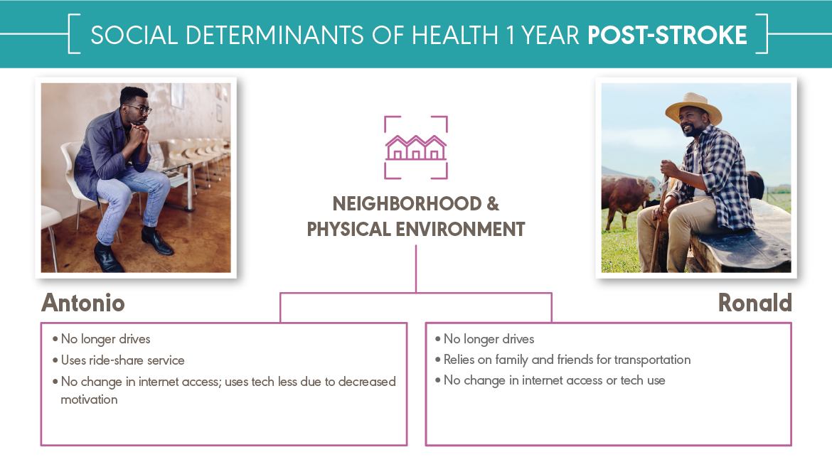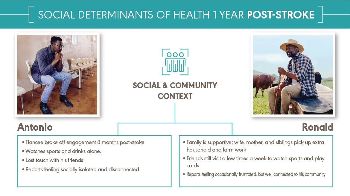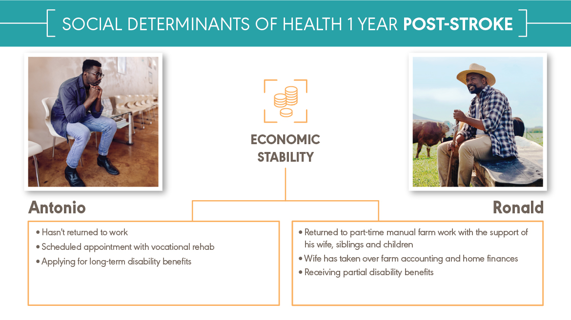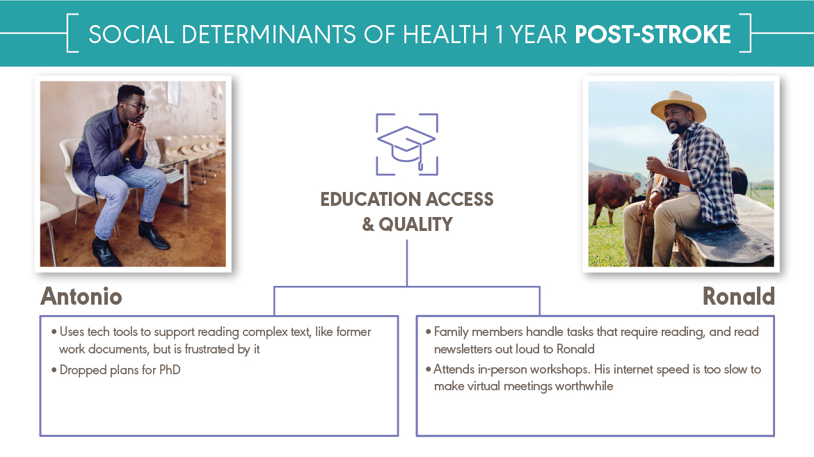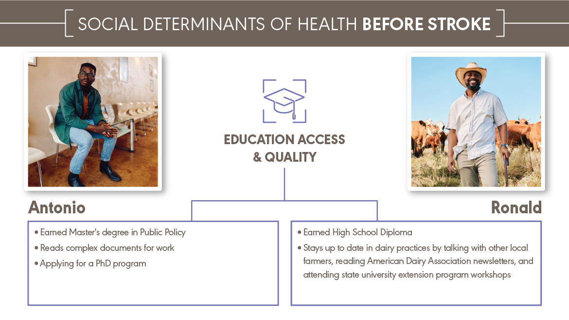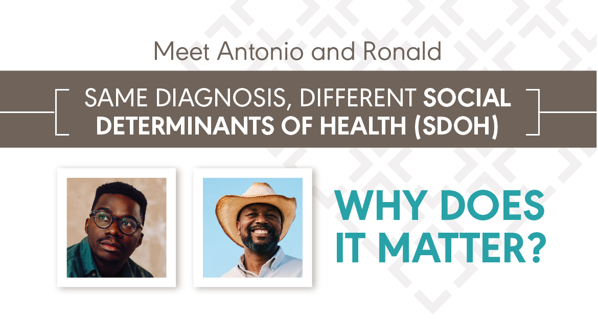 Antonio and Ronald both experienced a major health event—a stroke. They received the same medical diagnosis. They have different social determinants of health (SDOH). Antonio and Ronald are fictional characters, but they represent the many people with the same diagnosis and different SDOH that audiologists and speech-language pathologists work with every day. You can explore how a stroke affects Antonio and Ronald’s SDOH below and download the content at the bottom of the page.