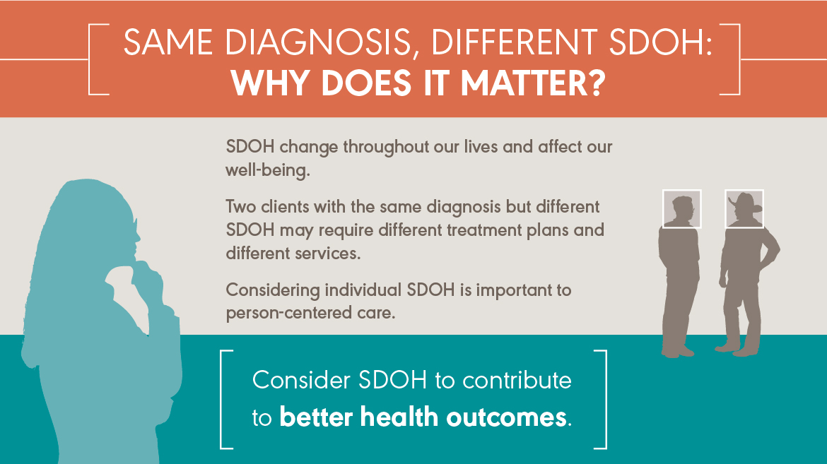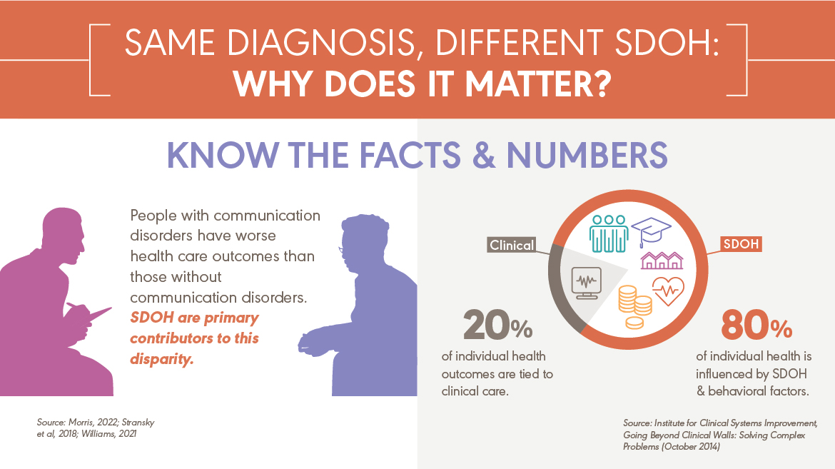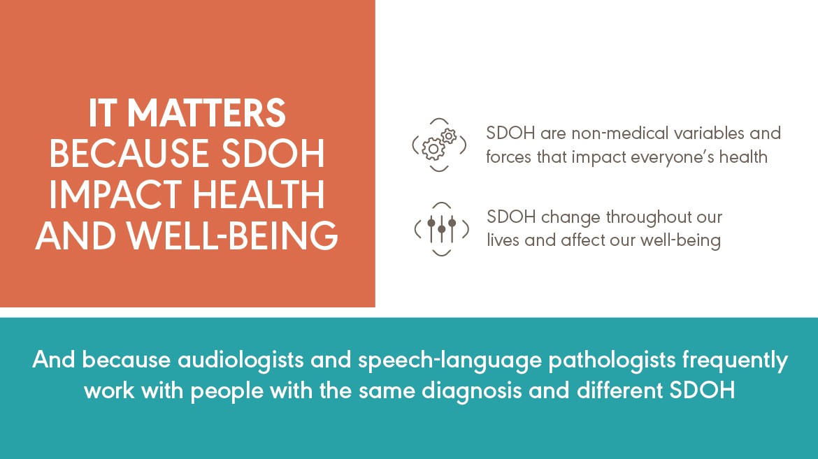 CSD professionals know that no two clients have identical health. When people have the same medical or communication diagnosis, their health outcomes may be different. As audiologists and speech-language pathologists learn more about clients’ social determinants of health (SDOH), they can use this information to spot potential barriers and draw upon someone’s strengths. Incorporating SDOH information into treatment is a crucial part of providing patient centered care.