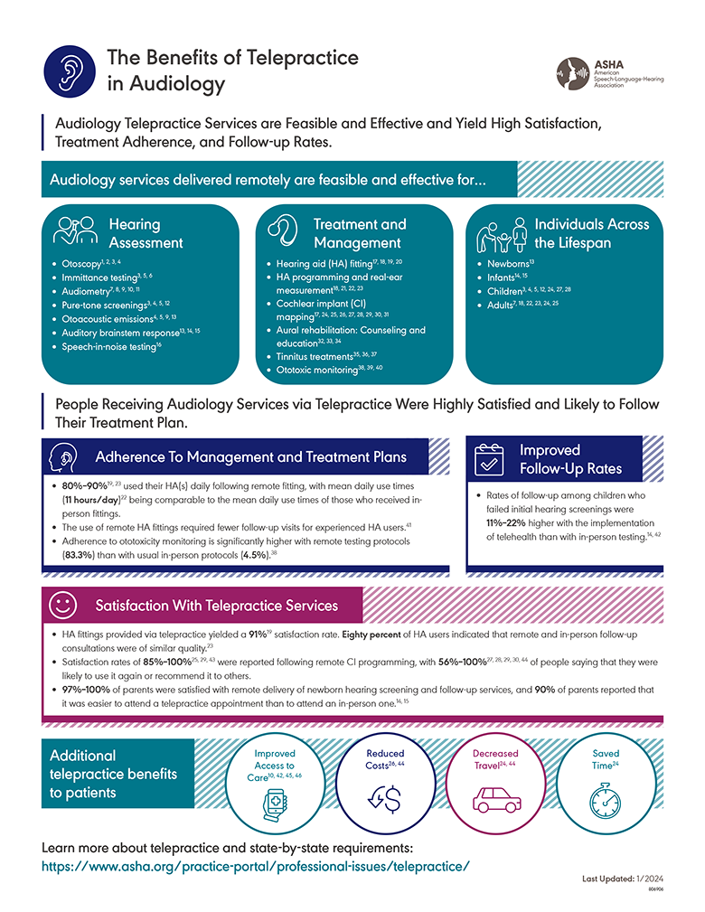 Citation: American Speech-Language-Hearing Association. (2024). The Benefits of Telepractice in Audiology. www.asha.org/siteassets/ebp/dov/benefits-of-telepractice-in-audiology.pdf