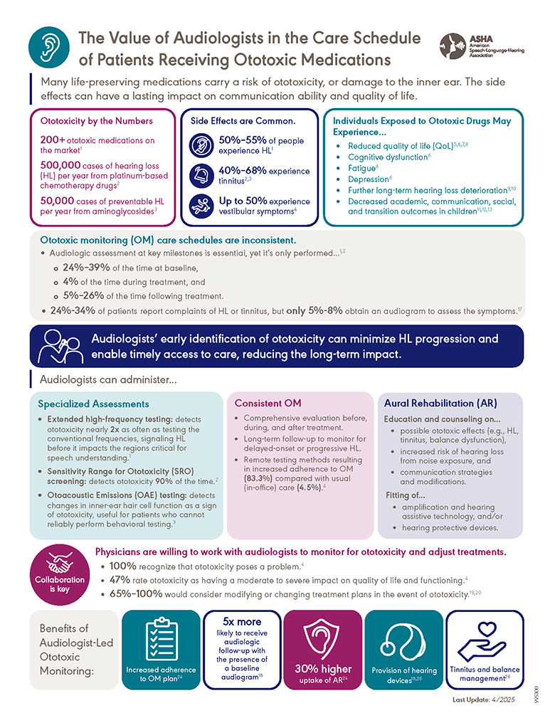Citation: American Speech-Language-Hearing Association. (2025). The Value of Audiologists in the Care Schedule of Patients Receiving Ototoxic Medications. www.asha.org/siteassets/ebp/dov/ototoxicity.pdf