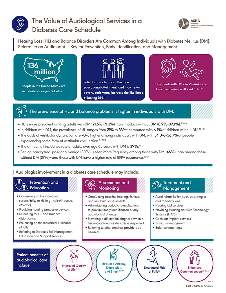 Citation: American Speech-Language-Hearing Association. (2024). The Value of Audiological Services in a Diabetes Care Schedule. www.asha.org/siteassets/ebp/dov/value-of-audiological-services-in-a-diabetes-care-schedule.pdf