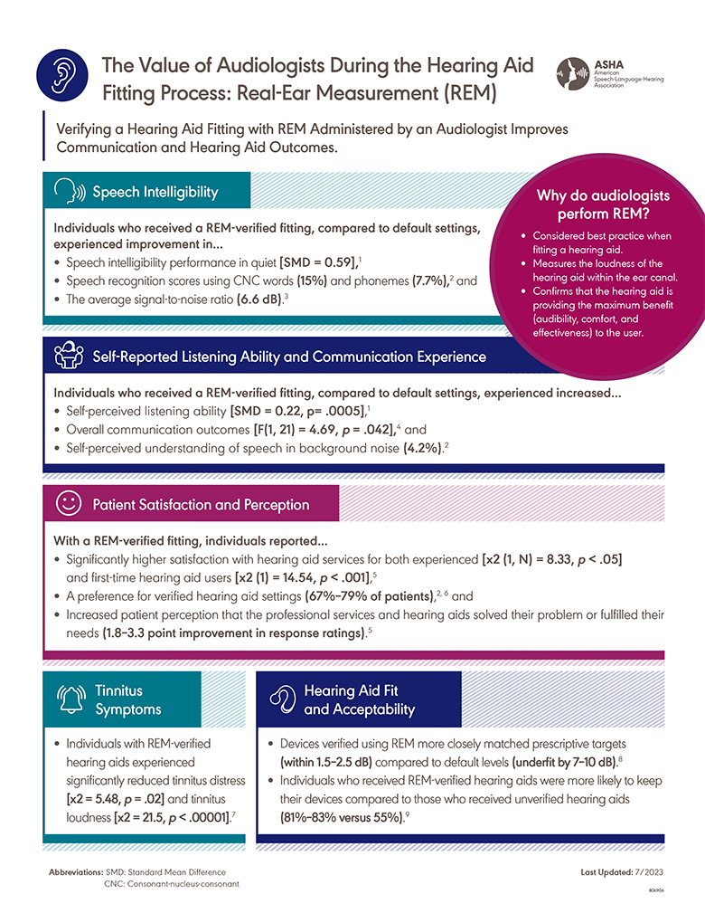 Citation: American Speech-Language-Hearing Association. (2023). The Value of Audiologists During the Hearing Aid Fitting Process: Real-Ear Measurement (REM). www.asha.org/siteassets/ebp/dov/value-of-audiologists-during-hearing-aid-fitting-process-real-ear-measurement.pdf